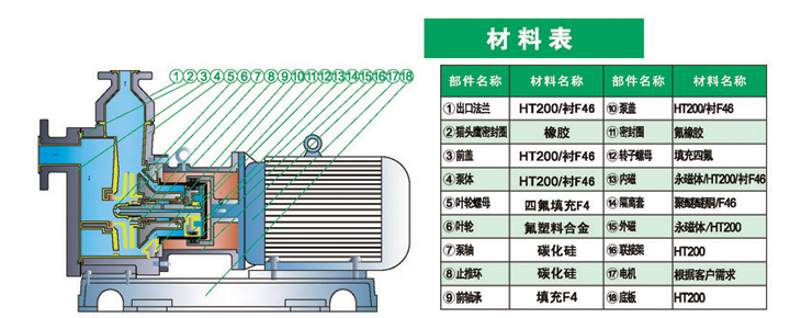 2.泵體、內(nèi)轉(zhuǎn)子、泵蓋、葉輪、隔離套等過流部件材質(zhì)均采用上海三愛富新材料股份有限公司或美國杜邦集團(tuán)有限公司生產(chǎn)的聚四氟乙烯和聚全氟乙丙烯樹脂;